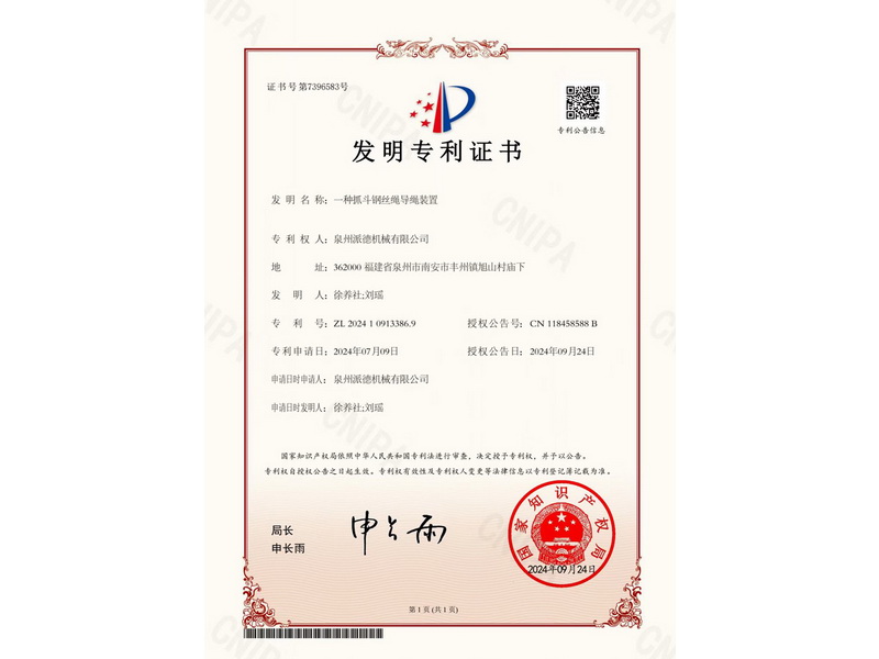 實(shí)用新型專利證書(一種抓斗鋼絲繩導(dǎo)繩裝置)